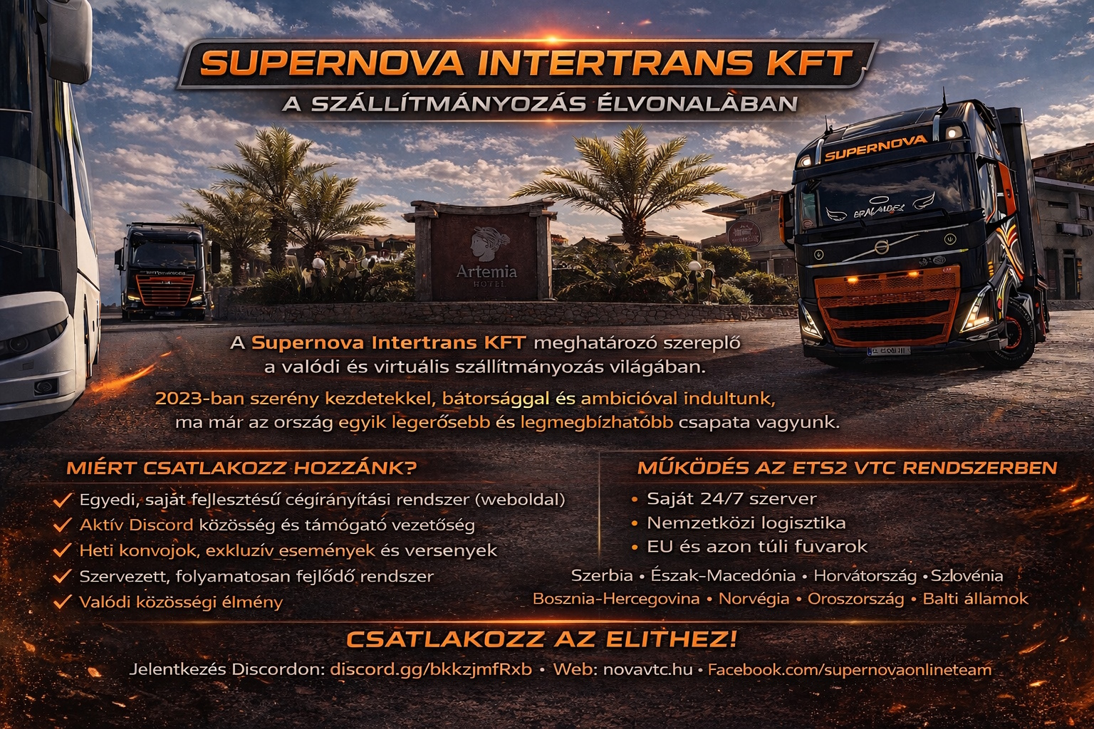 Supernova Intertrans KFT is a key player in the world of transport, both in real life and in the virtual space. Our virtual company was founded in 2023 with modest beginnings, but we always had the courage to push beyond the unknown. Today, we have grown into one of the strongest and most reliable transport companies nationwide.